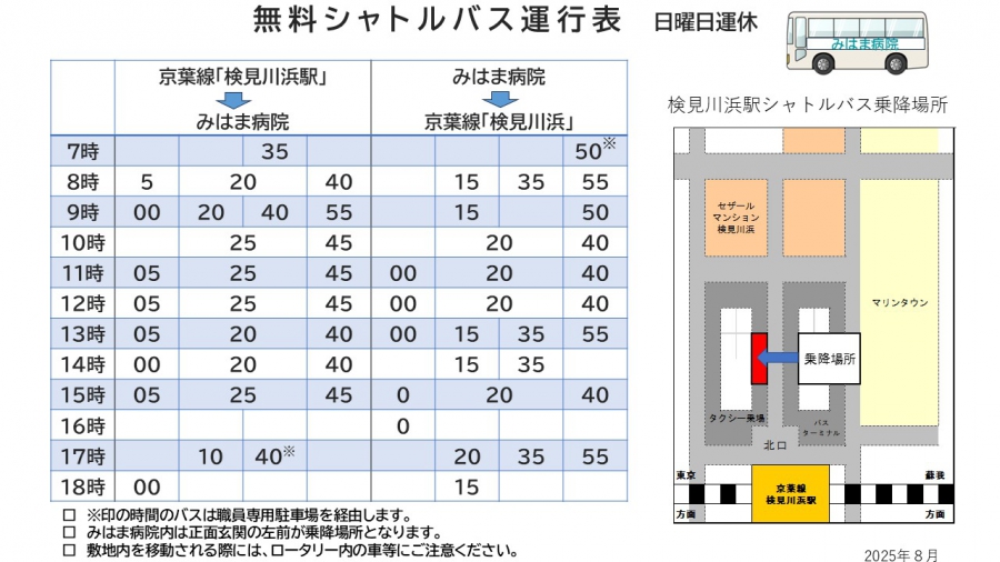 | 無料シャトルバスを ご利用の場合 (日曜日運休) | 京葉線「検見川浜」駅 北口より シャトルバス(マイクロバス)5分 北口を出て左側のロータリー(タクシー乗り場の後ろあたり)が乗降場所です。バス停はございませんのでご注意下さい。運行表は、一番下のページにてご確認下さい。 |